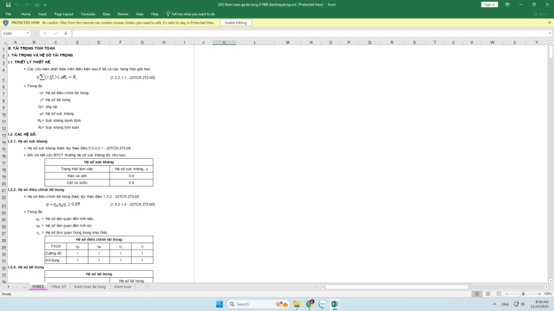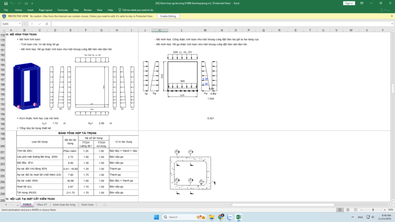 - Bảng tính kết cấu hố ga – Tải trọng tính toán