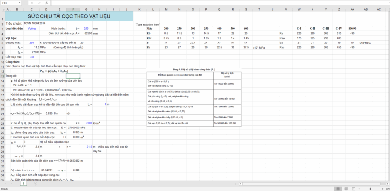 Bảng tính sức chịu tải cọc theo TCVN 10304:2014 là bảng tính sức chịu tải cọc theo tiêu chuẩn TCVN 10304:2014 ‘Móng cọc – Tiêu chuẩn thiết kế’, tiêu chuẩn này được áp dụng để thiết kế móng cọc của công trình xây dựng.