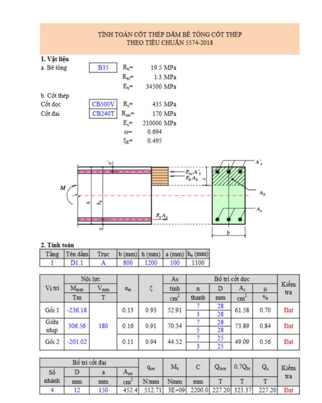 Bảng tính dầm bê tông cốt thép theo tiêu chuẩn TCVN 5574-2018 (BTKC0028)