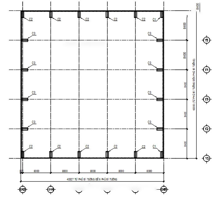 – chiều rộng 42m không cột giữa cho khung chính, bước cột hồi 8.4m